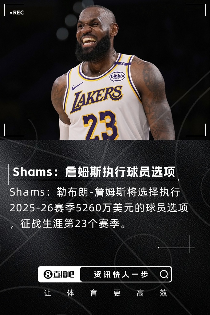 06月29日讯 据ESPN名记Shams报道,詹姆斯经纪人、Klutch Sports首席执行官里奇-保罗向ESPN透露,洛杉矶湖人前锋勒布朗-詹姆斯将选择执行2025-26赛季5260万美元的球员选项。