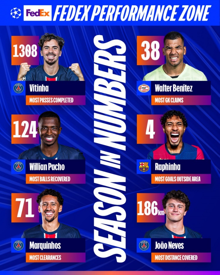 6月3日讯 随着大巴黎问鼎大耳朵杯,2024/25赛季欧冠已落下帷幕。欧冠官方统计了球员各项数据之最,其中109次成功突破的亚马尔成为过人王,姆巴佩射中球门27次最高。