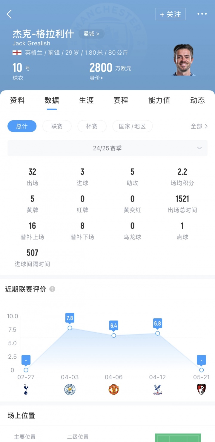 格拉利什2021年夏窗以1.18亿欧元转会费加盟曼城,截至目前共为曼城出场157次打入17球23助攻。