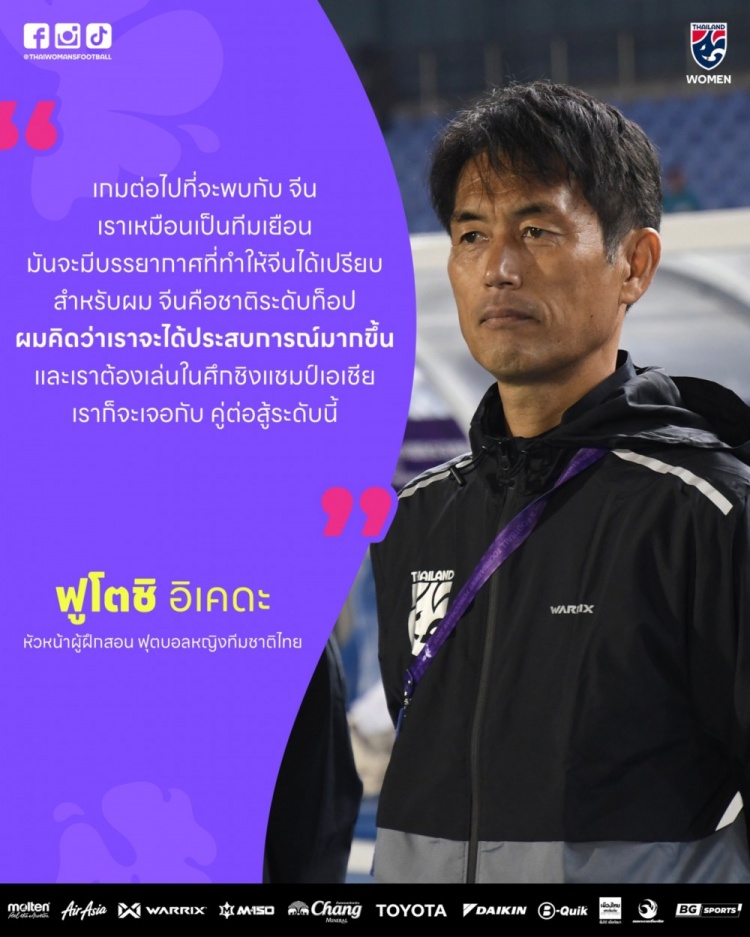 泰国女足主教练池田太:“这场比赛没什么特别的,我们拼尽全力,战术是一回事,每个人都一直跑动才赢得比赛,中场休息时我跟队员说,上半场结束时被进球,而对手喜欢长传而且跑得很快,因此我们尽量不让他们有机会传长球,避免在身体对抗和速度上处于劣势,同时必须注意拿到第二落点并保持防守层次。