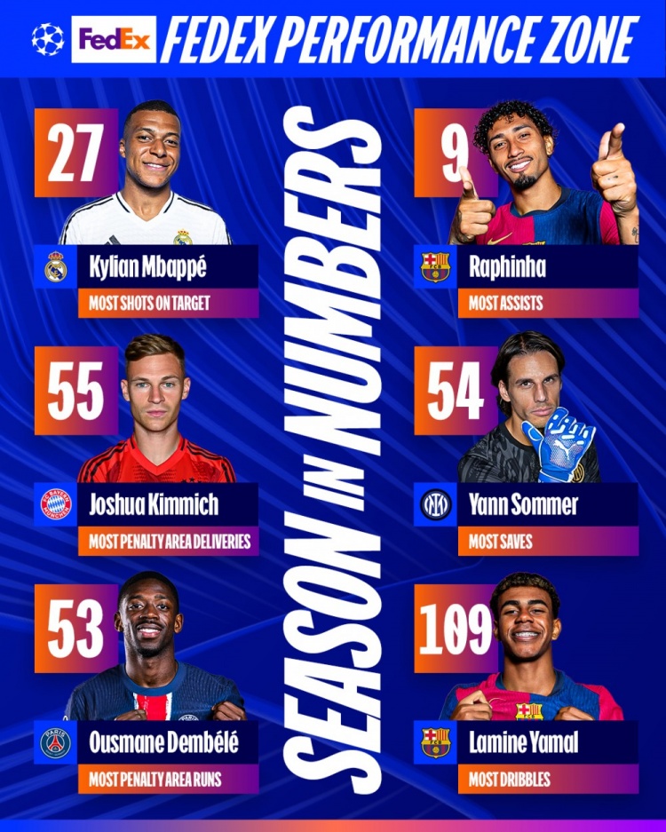 6月3日讯 随着大巴黎问鼎大耳朵杯,2024/25赛季欧冠已落下帷幕。欧冠官方统计了球员各项数据之最,其中109次成功突破的亚马尔成为过人王,姆巴佩射中球门27次最高。