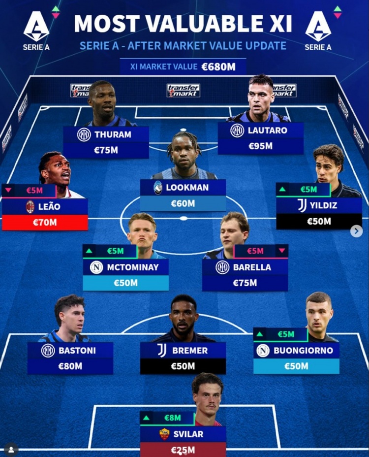 6月17日讯 意甲球员德转身价今日更新,德转列出了意甲身价最贵阵,劳塔罗、小图拉姆搭档锋线,麦克托米奈、伊尔迪兹、莱奥在列。