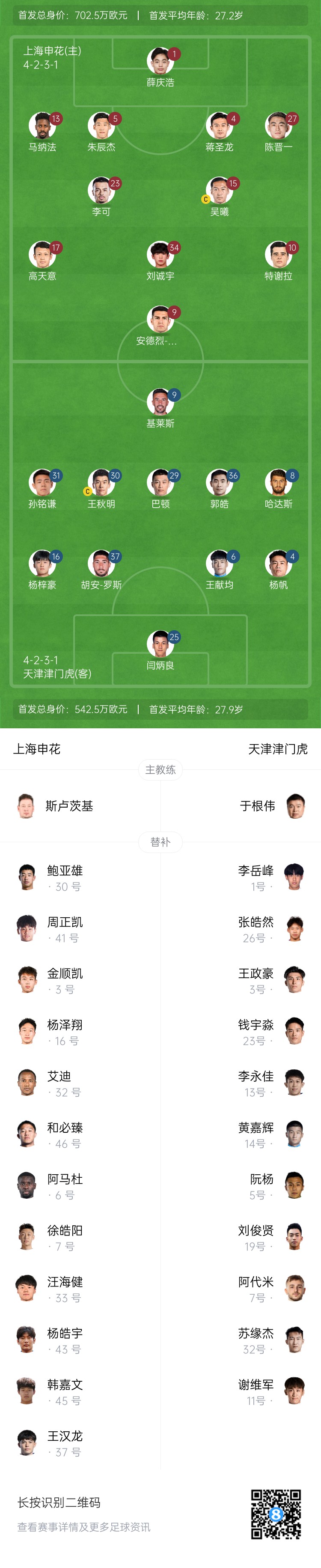 上海申花首发:1-薛庆浩、4-蒋圣龙、5-朱辰杰、13-马纳法(F)、27-陈晋一、15-吴曦、17-高天意、23-李可、10-特谢拉(F)、34-刘诚宇、9-安德烈-路易斯(F)