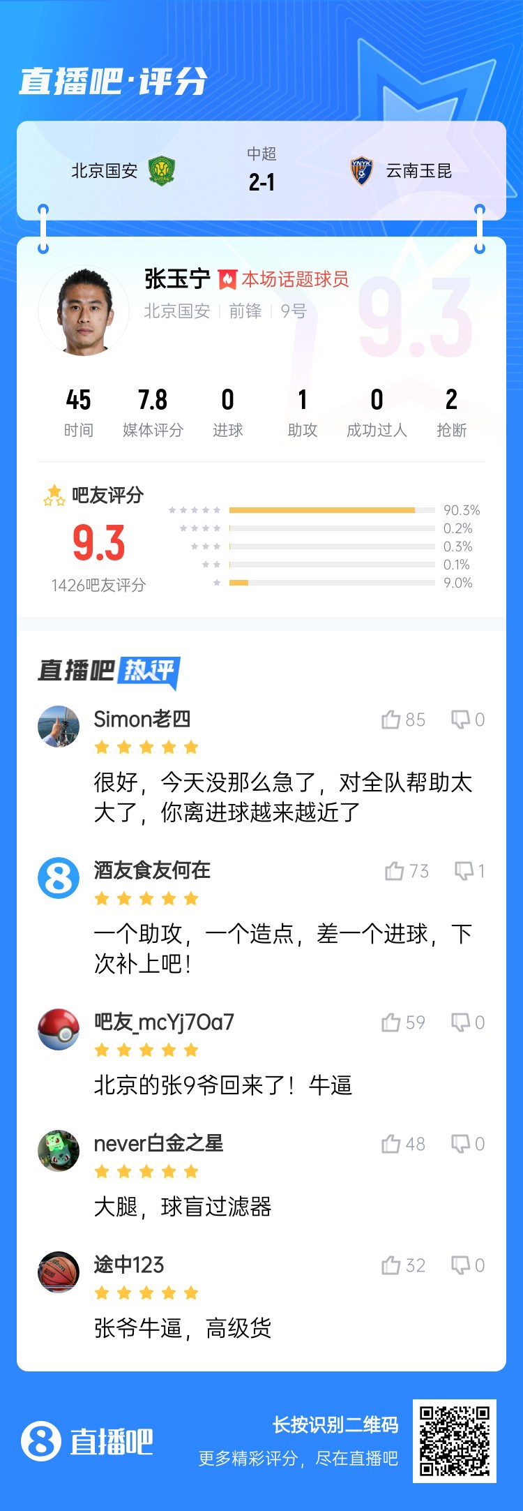 张玉宁半场替补完成自己的使命,打破心魔逆转比分,帮助国安拿下关键胜利继续领跑!
