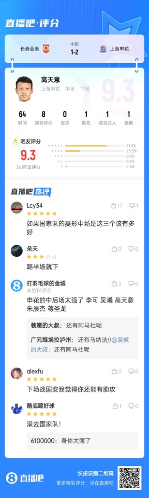 【】中超第五轮最佳球员:李源一!吧友评分9.9国产助攻王